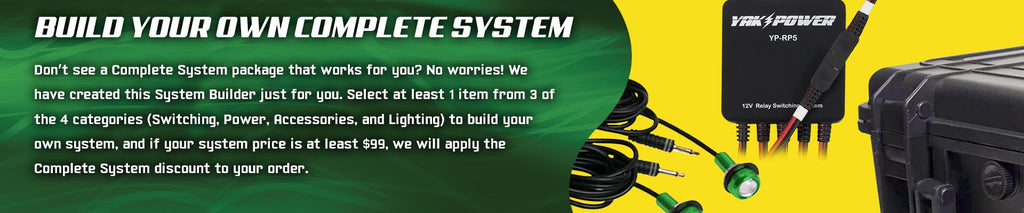 All Yak Power switching systems feature plug-and-play connectivity to a power source. If you already have a battery setup then you will only need one of our Battery Terminal Pigtails. If you don’t already have a battery then you might want to consider our Power Pack Battery Box that makes powering your Yak Power system and maintaining your batteries easy.